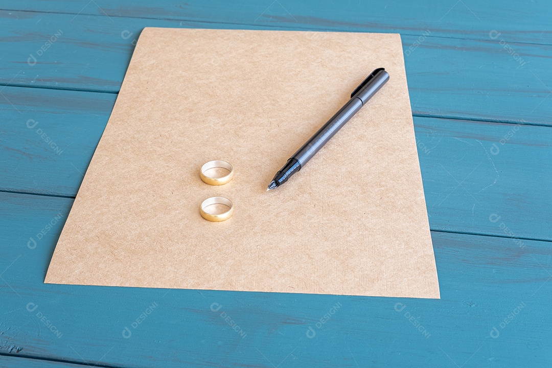Caneta-Tinteiro Cinza Em Papel Pardo e ao Lado de Anéis de Casamento