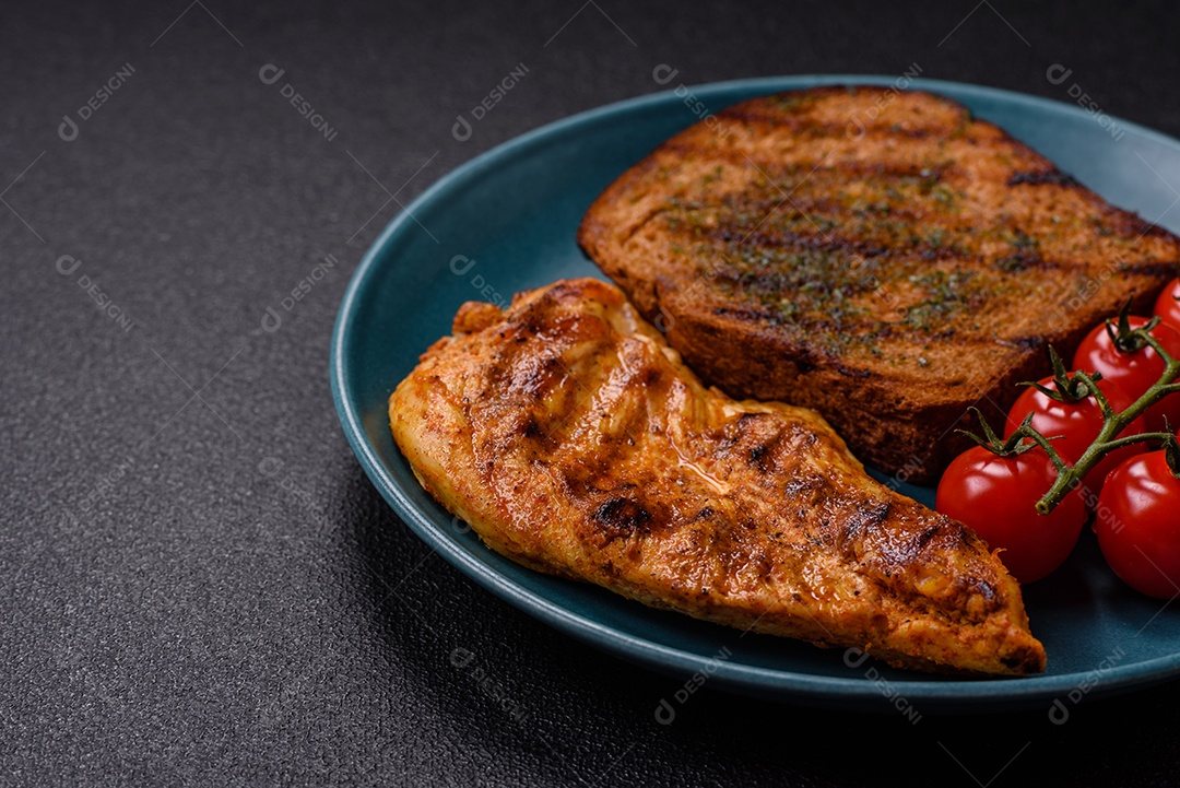 Delicioso filé de frango grelhado fresco com especiarias e ervas em um fundo escuro de concreto. Um prato cozido no fogo