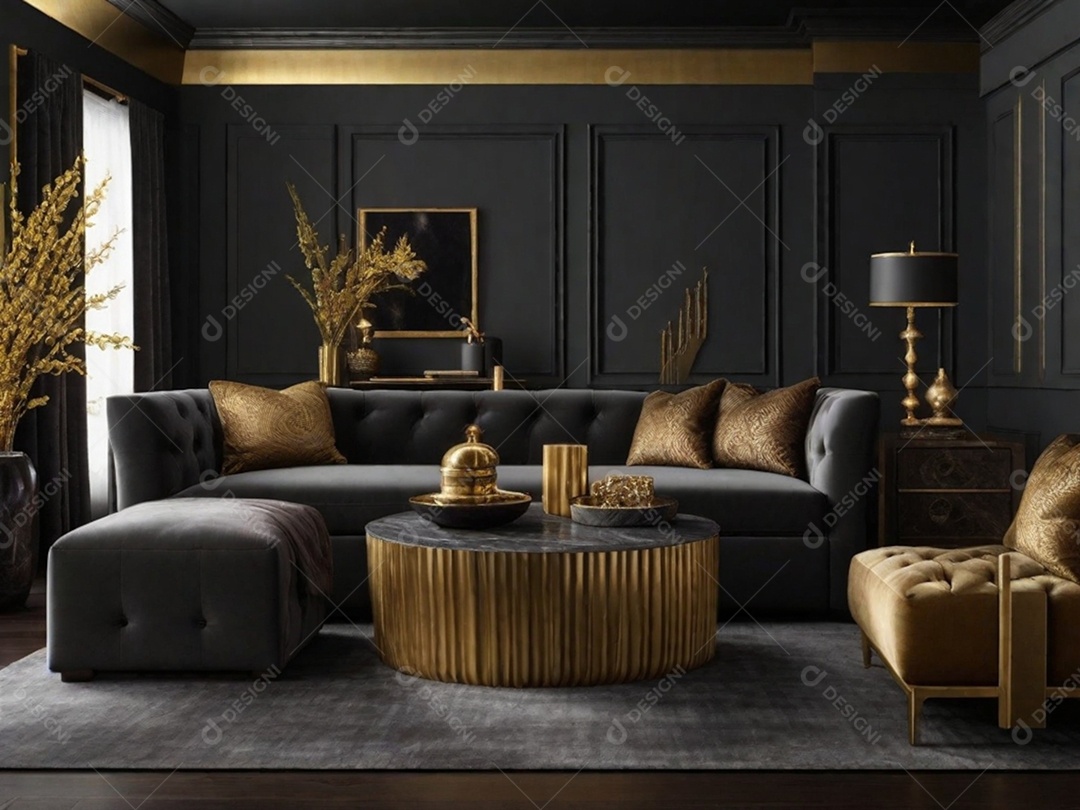 Combine paredes cinza escuro com texturas luxuosas como veludo, det...