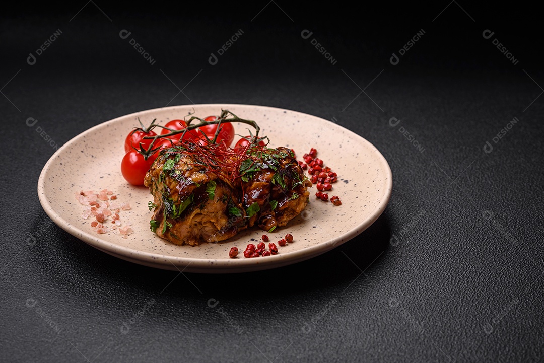 Delicioso frango frito suculento em molho teriyaki com sal, especiarias, ervas e sementes de gergelim num prato cerâmic