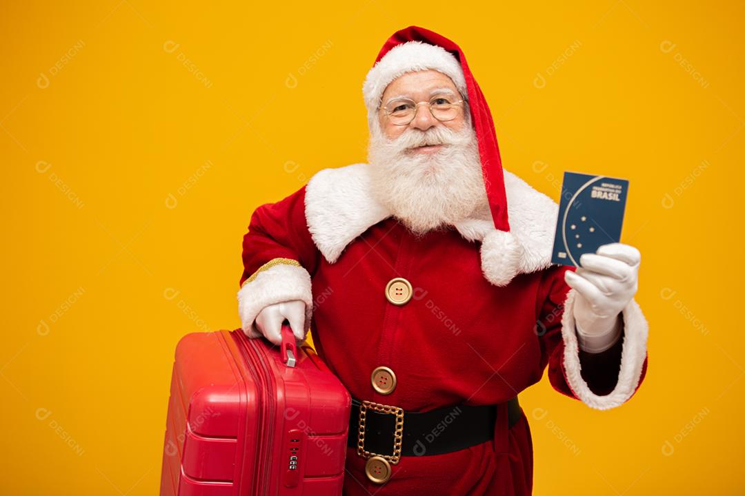 Papai Noel com sua mala. Segurando um passaporte brasileiro. Concei...