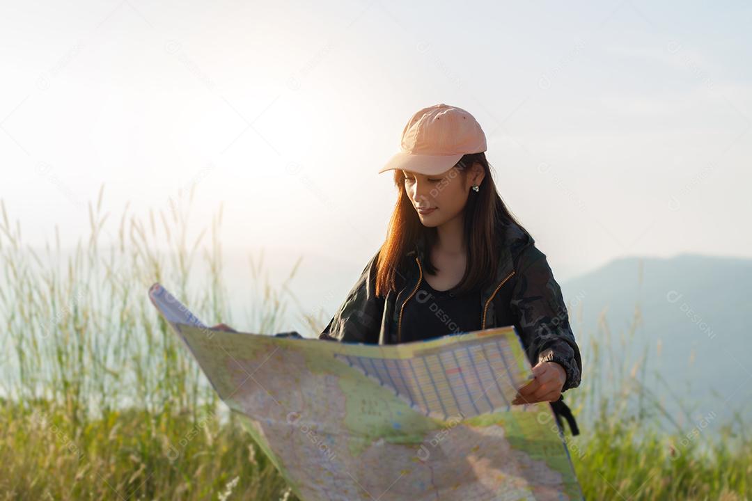 Mulheres jovens asiáticas caminhando com mochilas de amigos caminha...