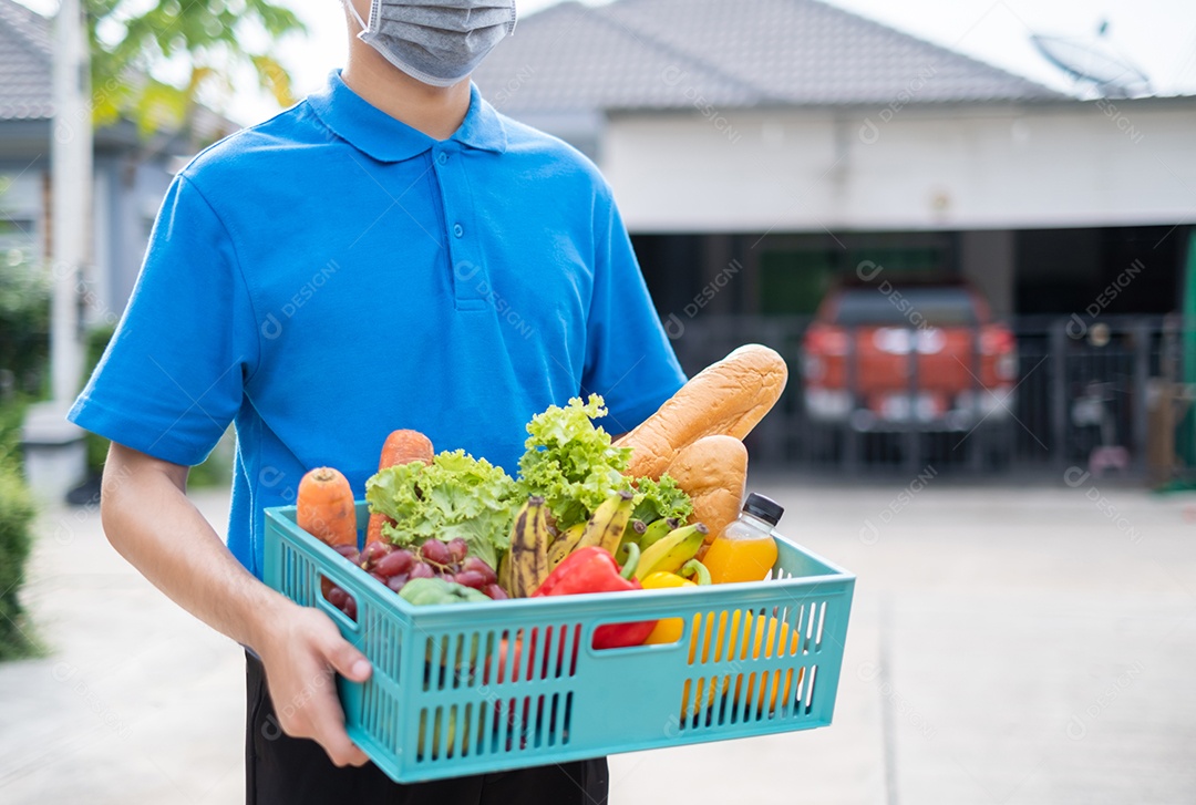 O homem asiático de entrega de comida em uniforme azul dá frutas e vegetais para a casa da frente do cliente receptor