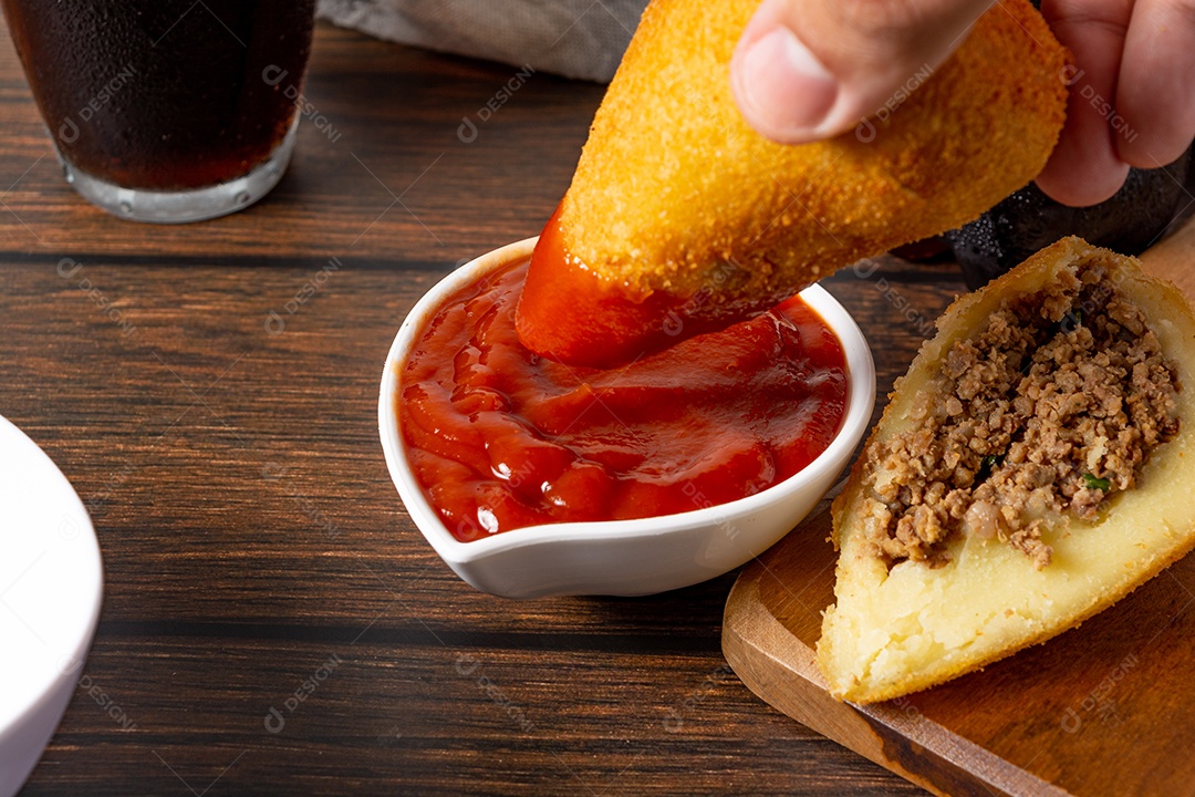 Coxinha lanche tradicional brasileiro frito em óleo e recheado com carne bovina ou carne de frango, com ketchup e refrigerante no fundo sobre mesa de madeira. foto vertical