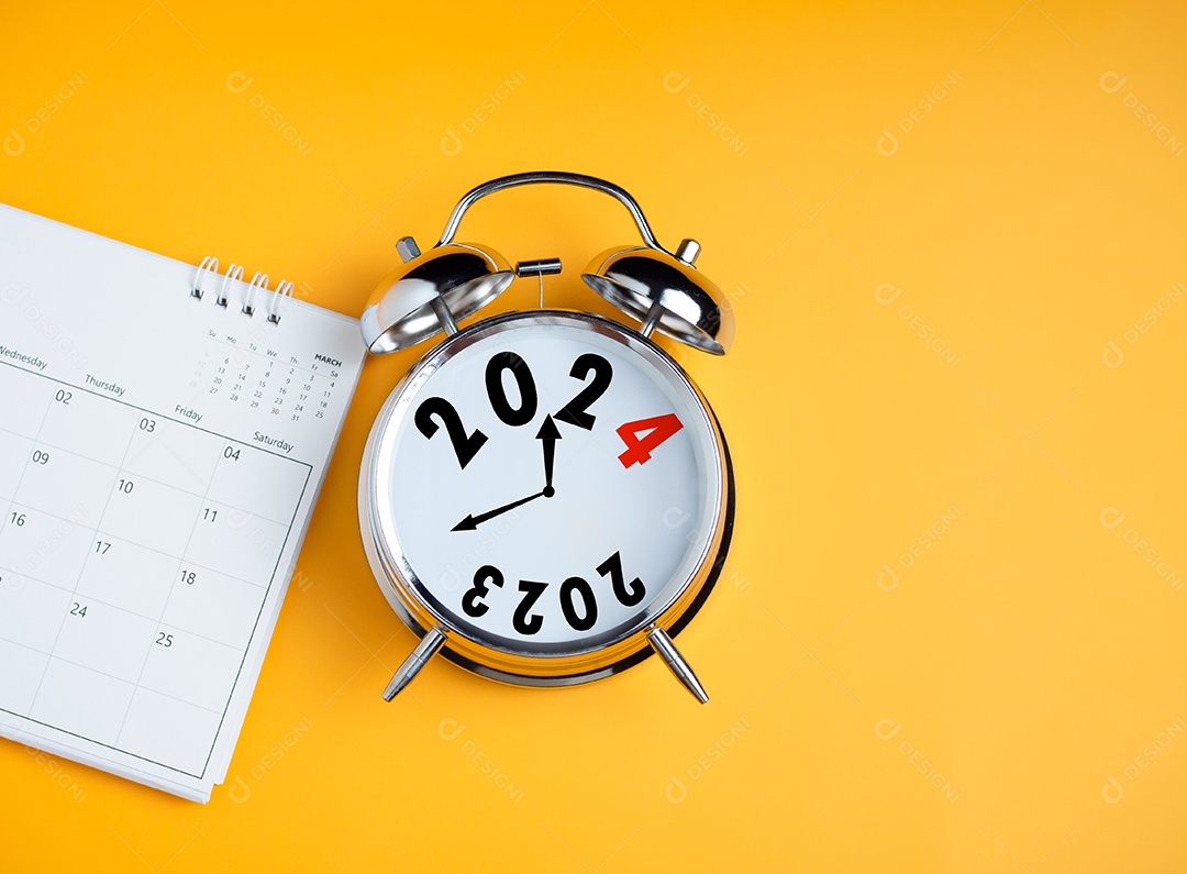 Close-up do calendário e relógio despertador em fundo amarelo com espaço de cópia. Transição de 2023 para 2024, Plano de inicialização de negócios, Contagem regressiva começando para 2024