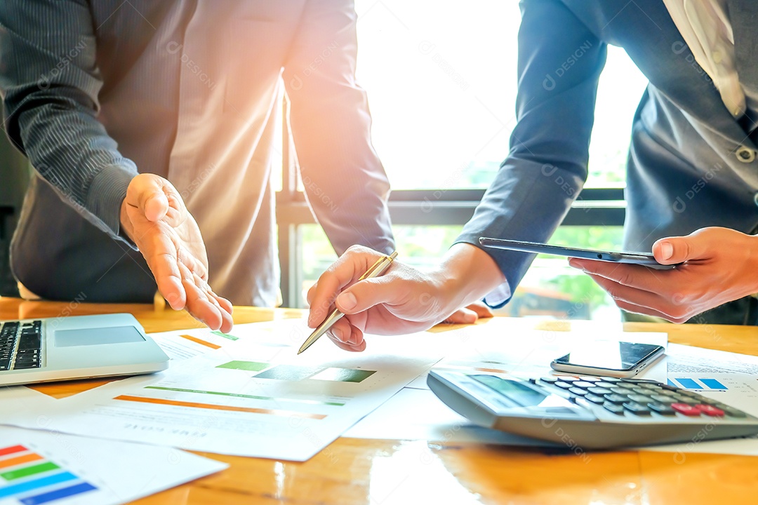 Dois homens de negócios apontando para um gráfico para analisar dados.