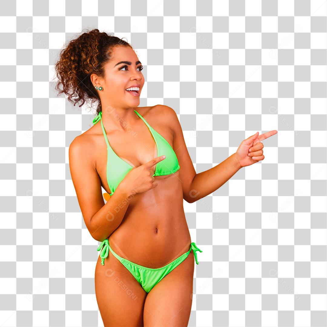 Mulher com roupa de praia biquíni verde apontando para o lado