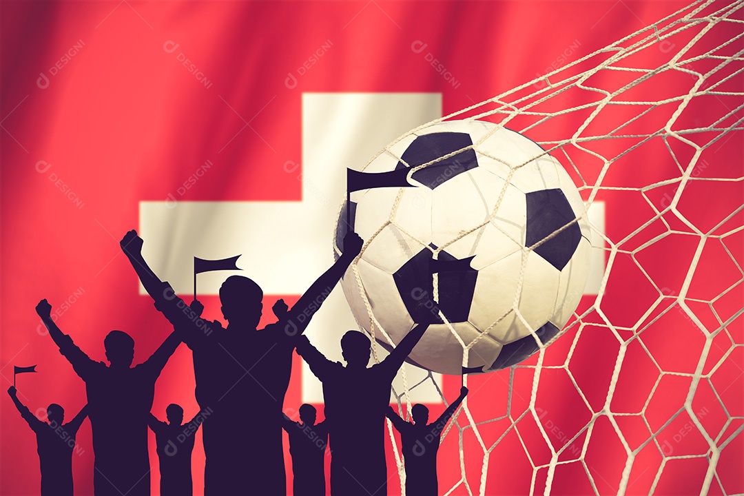 Silhuetas de fãs de futebol com bandeira da Suíça Cor vintage do co...