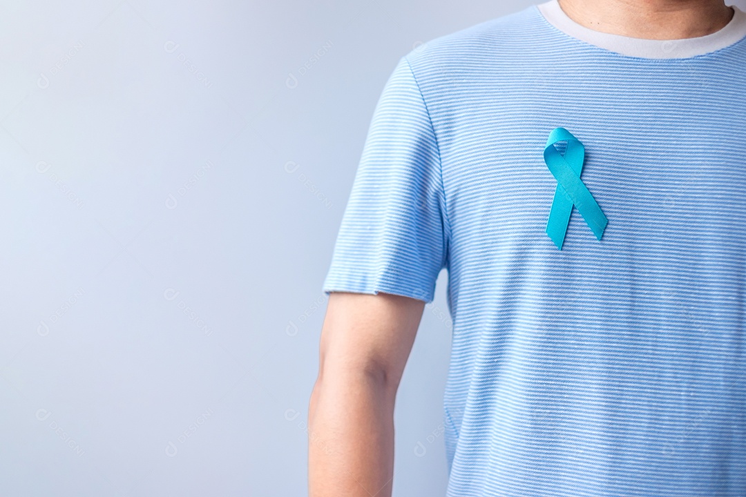 Mês de conscientização do câncer de próstata de novembro azul, homem de camisa azul com a mão segurando a fita azul  pai, diabetes e dia mundial do câncer