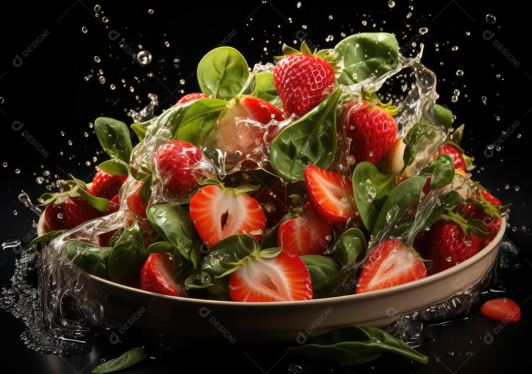 Frutas frescas Mix e salada com respingos de água flutuam no prato com fundo escuro de estúdio. IA generativa.
