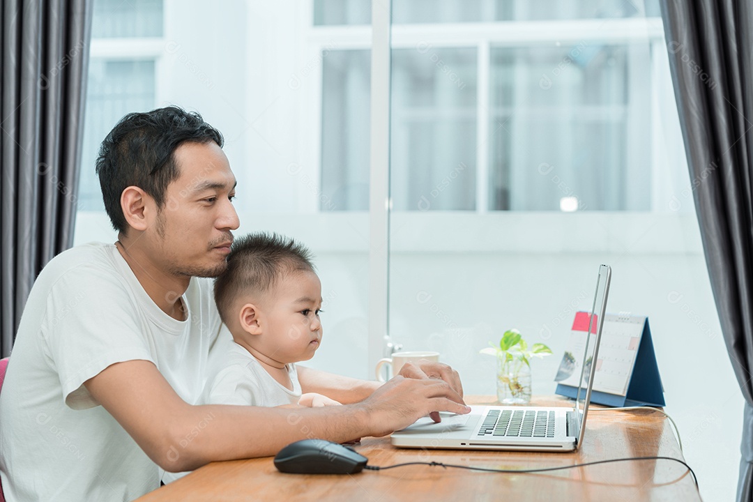 Pai asiático e filho pequeno digitando algo no computador
