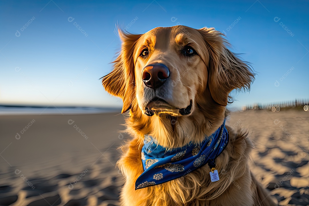 Um cão bonito da raça Golden Retriever com uma pata levantada em uma praia deserta. Ele está usando uma bandana azul em volta do pescoço e tem uma expressão serena no rosto. Ao fundo, você pode ver o oceano e o céu azul. IA generativa