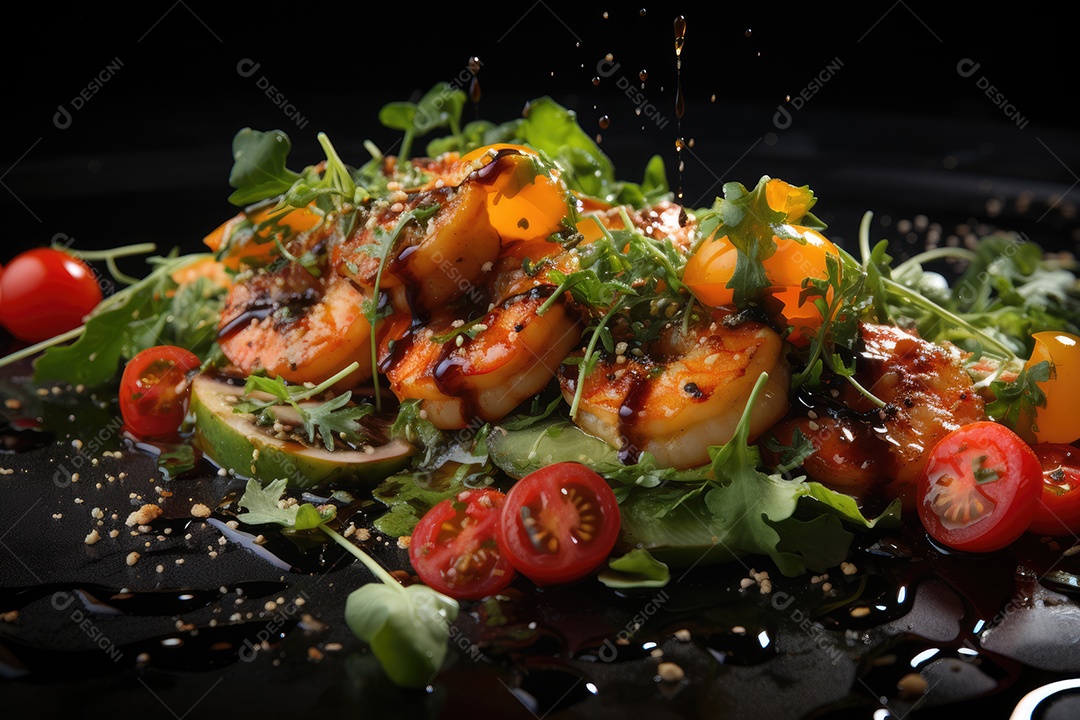 Explosão colorida salada fresca, camarões e croutons em harmonia.