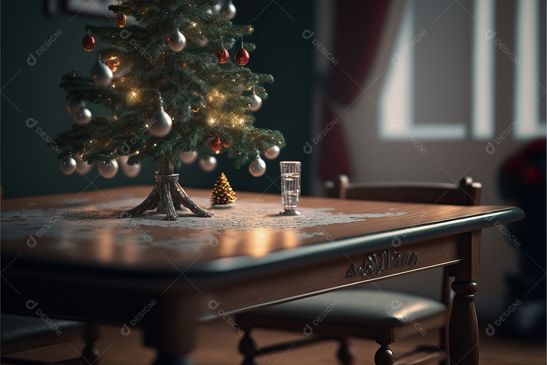 Cenário de mesa para celebração de Natal ou Ano Novo na sala de estar com lareira e árvore de Natal.