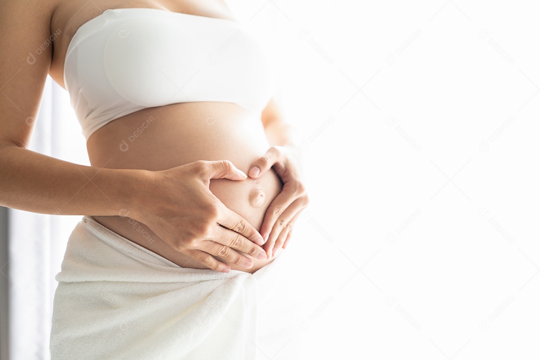 Mãe esperando bebê para uma mulher saudável e grávida tocando a barriga.