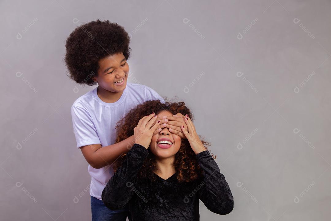 Mãe e filho abraçados com expressões de felicidade em fundo cinza