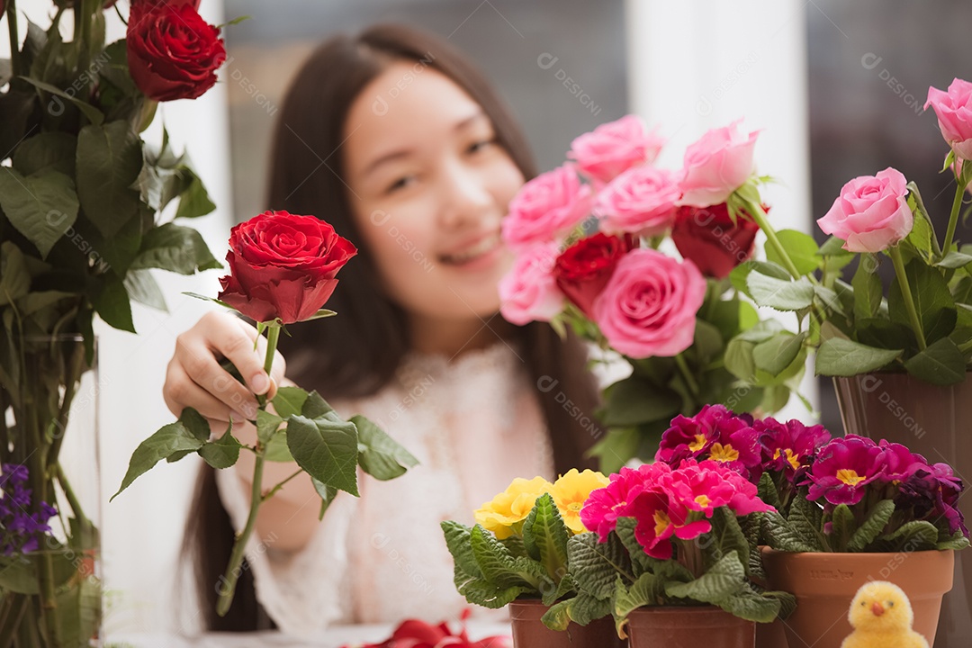Mulher se preparando para aparar rosas vermelhas e cor de rosa e li...
