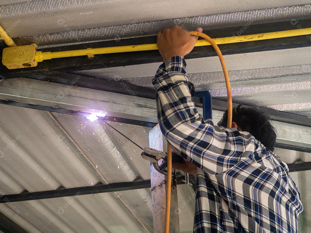 Um soldador está trabalhando em uma estrutura de aço. No canteiro d...