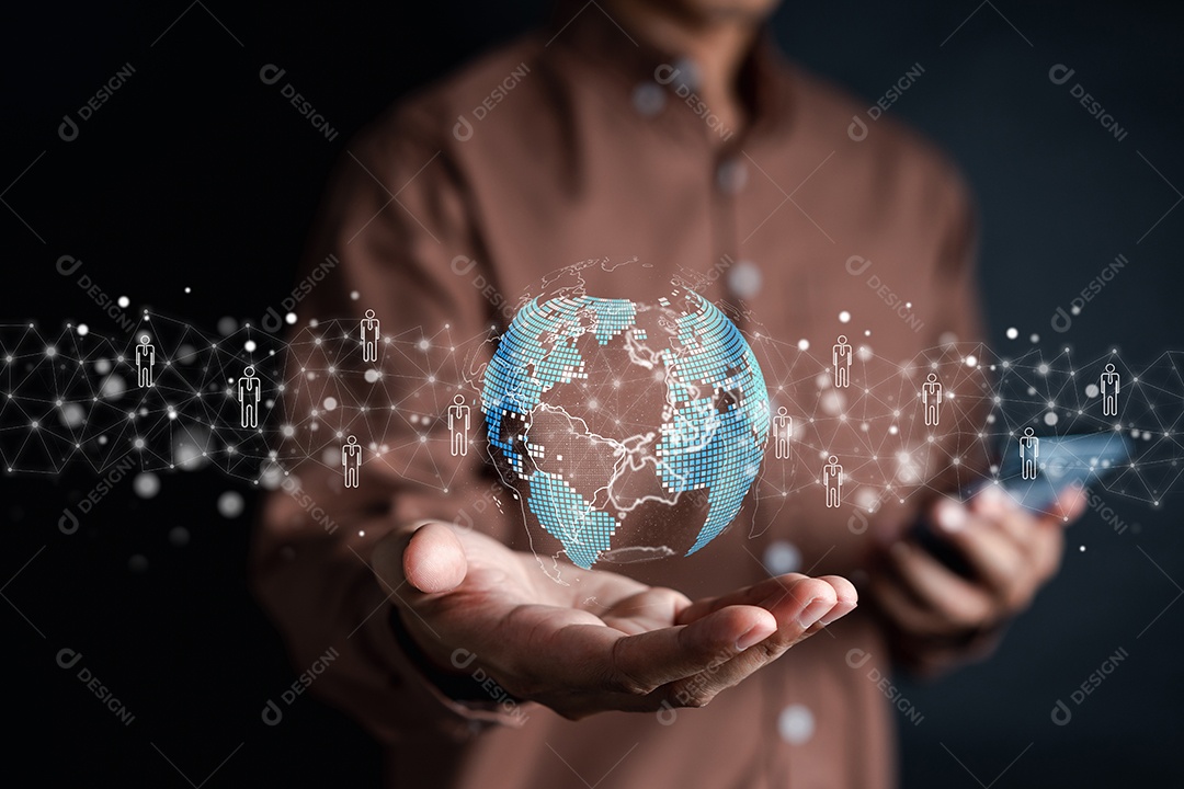 Conceito de conexão de cliente global de negócios. Empresário segurando negócios globais de dados de rede do mundo