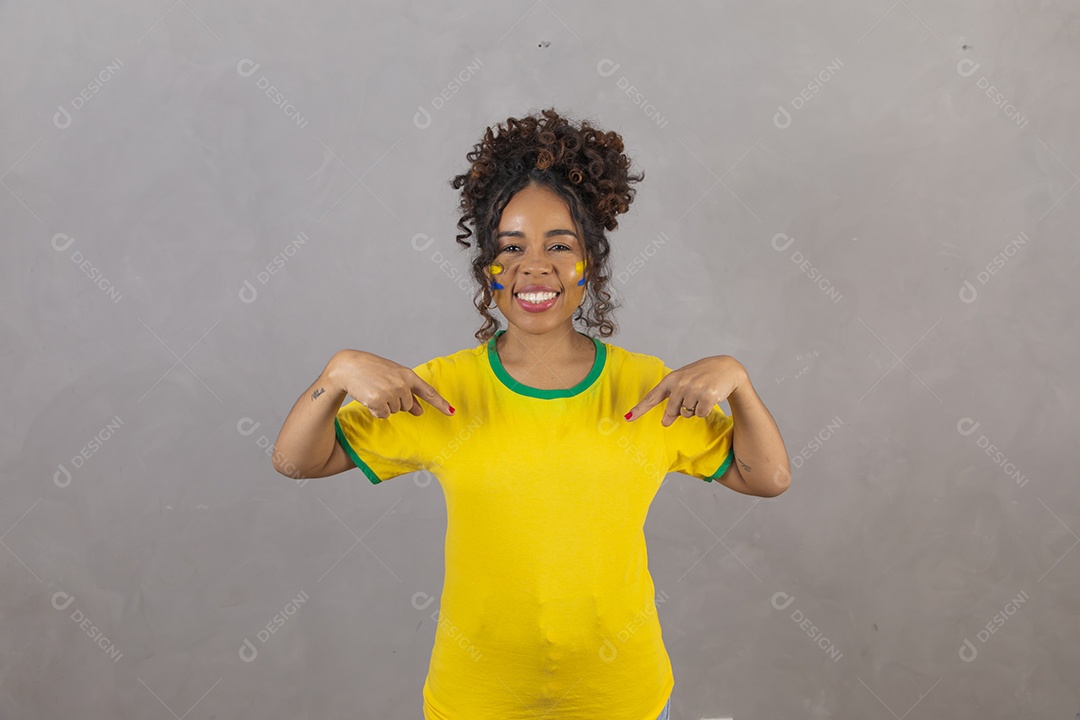 Linda mulher jovem morena segurando bandeira do brasil cabelo sobre fundo isolado amarelo