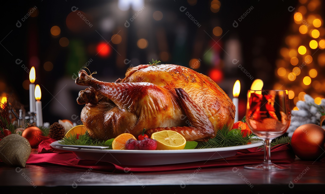 Peru assado suculento e saboroso no prato com decoração de Natal