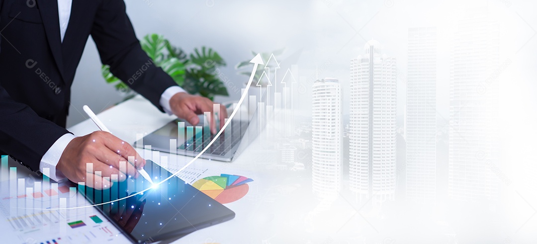 Conceitos de desenvolvimento de negócios para sucesso e crescimento. Empresário toca caneta stylus no tablet junto com documentos e computador para planejar o crescimento futuro, finanças