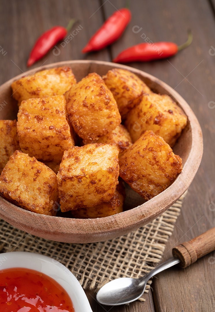 Dado de tapioca, comida típica do nordeste brasileiro com calda de pimenta malagueta sobre mesa de madeira.