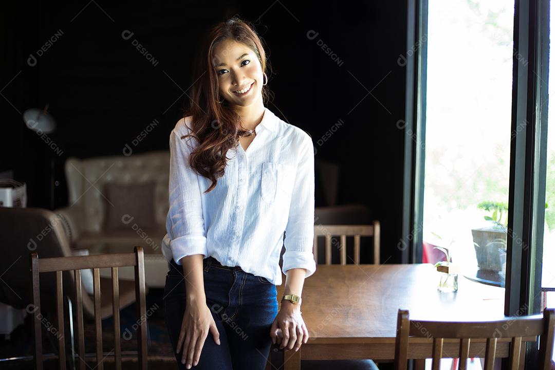 Mulheres asiáticas sorrindo e felizes Relaxando em uma cafeteria de...