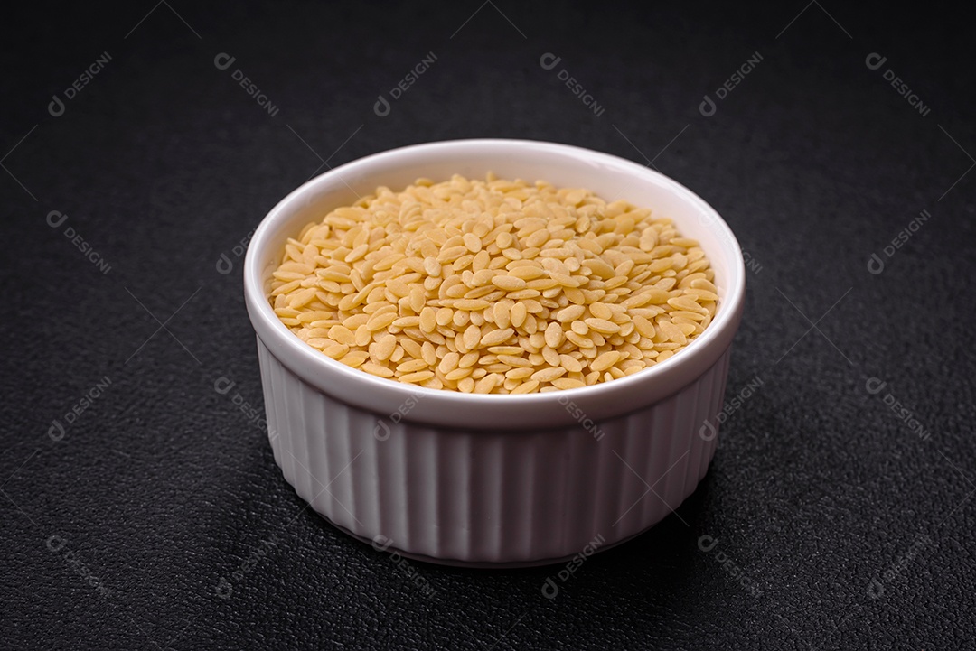 Grãos de mingau de trigo Ptitim em um fundo escuro de concreto. Pre...