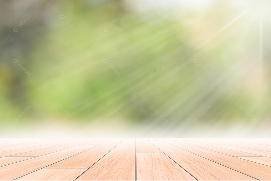 Piso de madeira pano de fundo bokeh verde Raios solares naturais