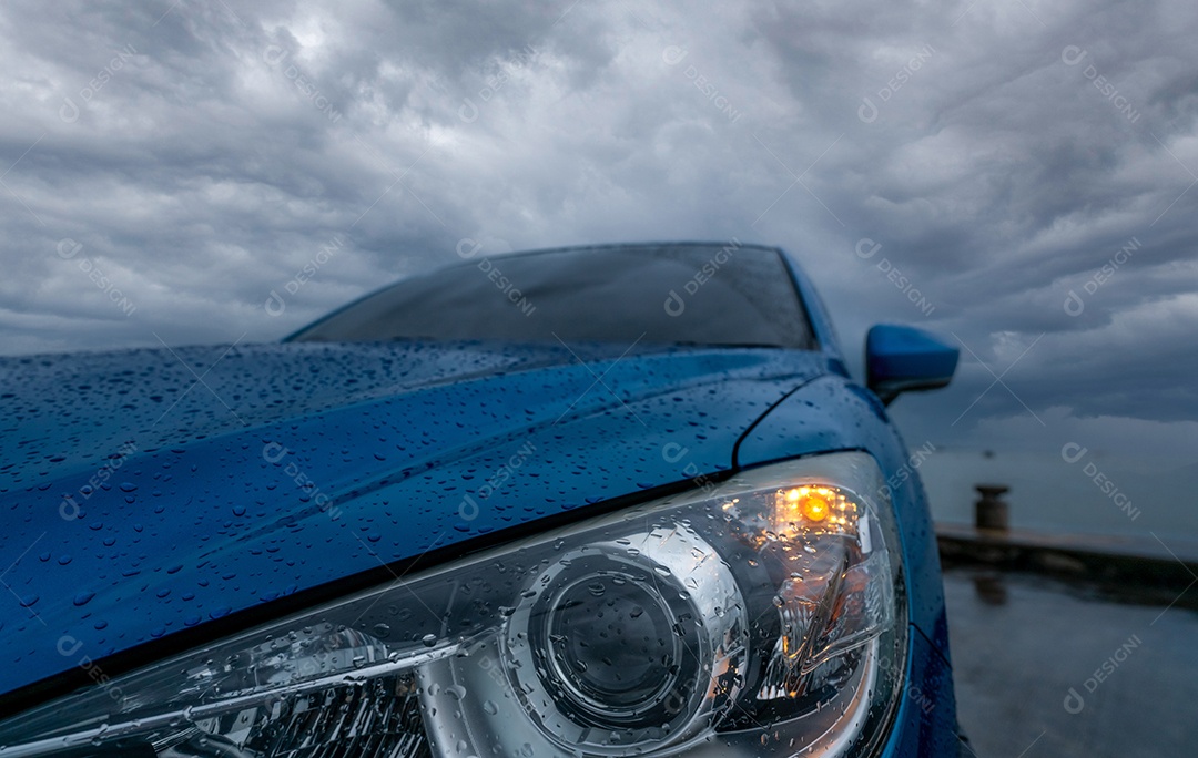 Foco seletivo nos faróis do carro SUV de luxo azul estacionado