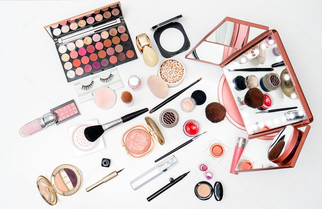 Foto Conjunto de Cosméticos para Maquiagem e Um Espelho Em Um Fundo Branco