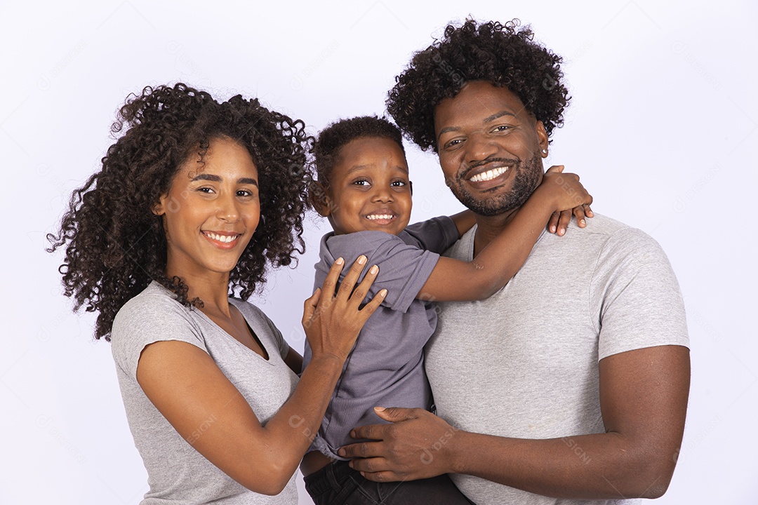 Mãe e pai feliz ao lado de seu filho sobre fundo isolado branco
