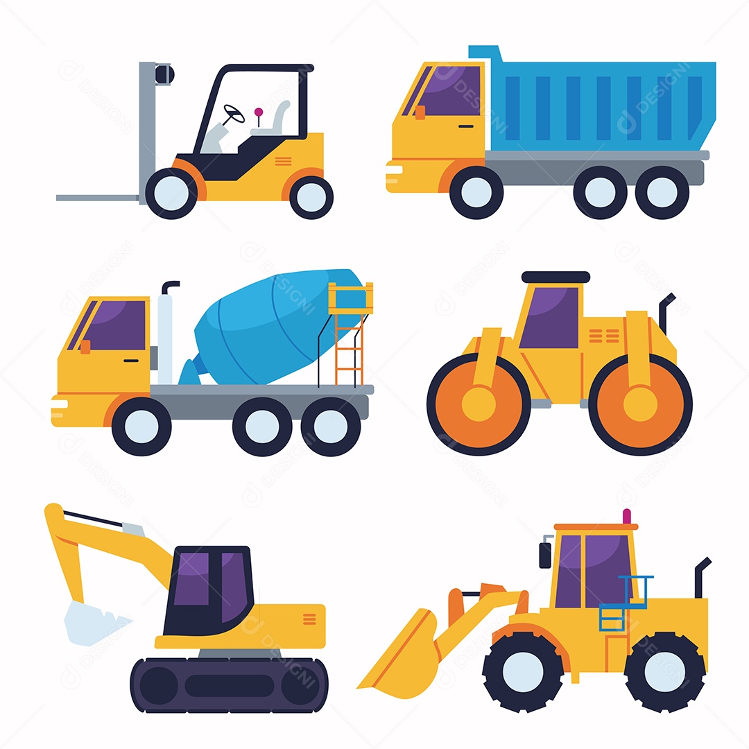 Os Veículos de construção incluem empilhadeiras caminhões betoneira...