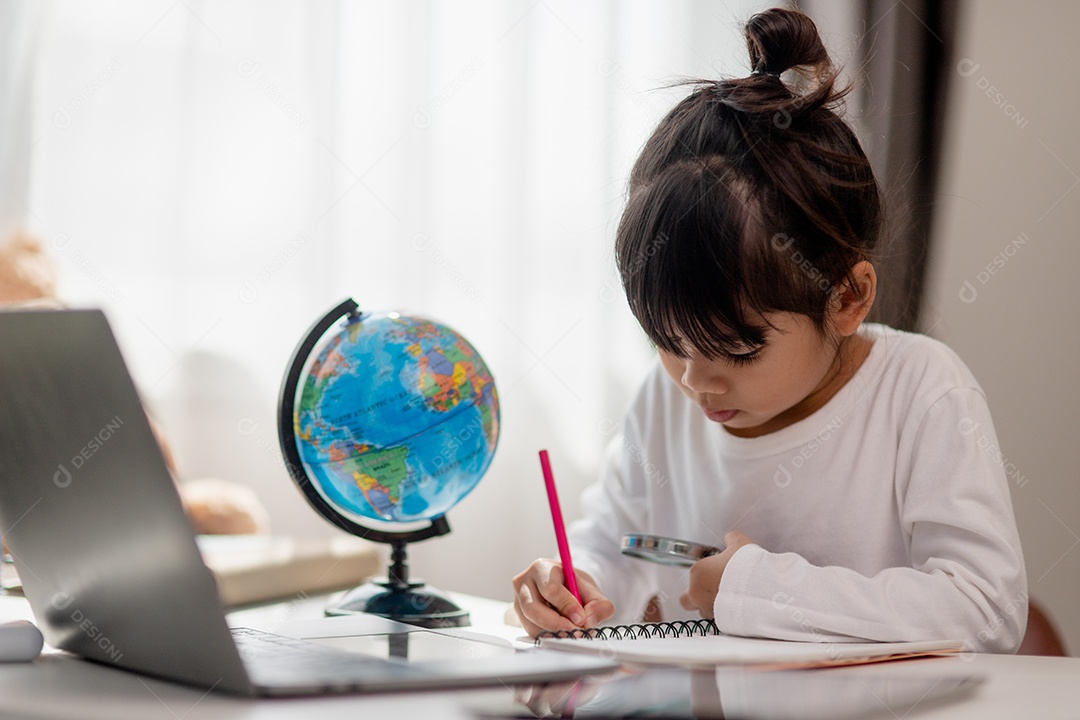 A menina asiática está aprendendo o modelo do globo, conceito de salvar.