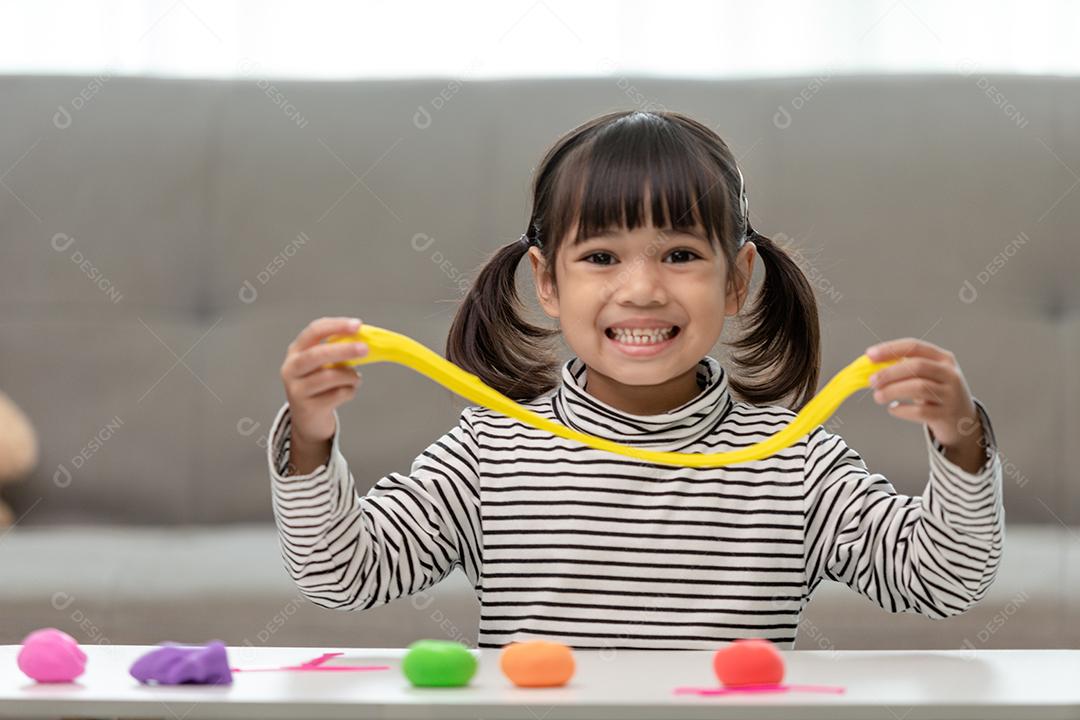 A garotinha está aprendendo a usar massinha colorida em um poço