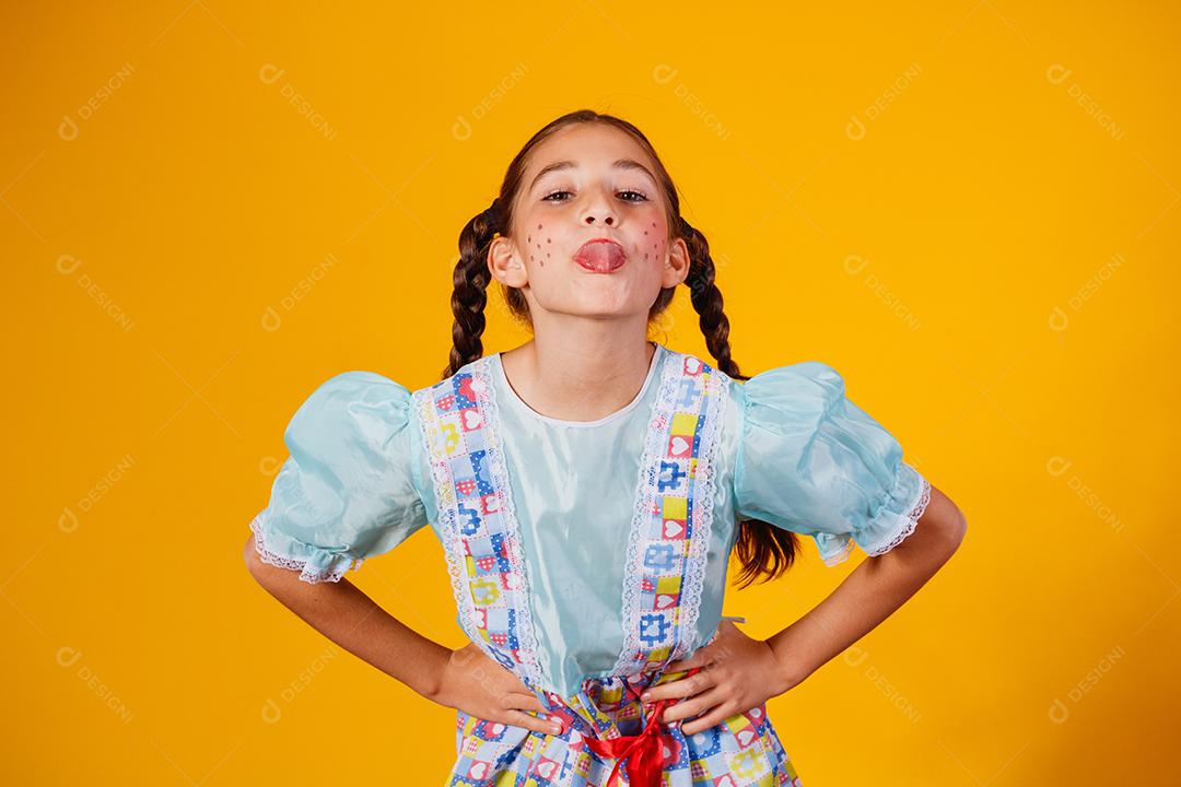Criança com roupas típicas da famosa festa brasileira chamada Festa Junina em comemoração ao São João. Linda garota em fundo amarelo.