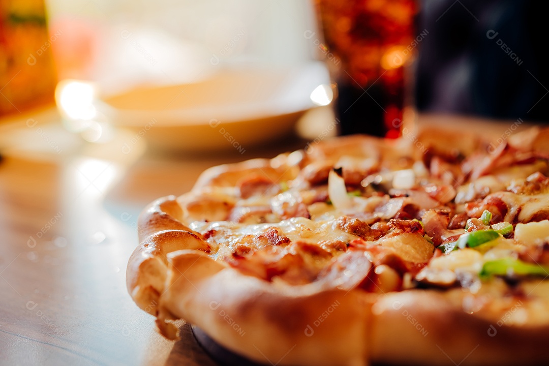 Pizza crosta de queijo molho de cobertura de frutos do mar.