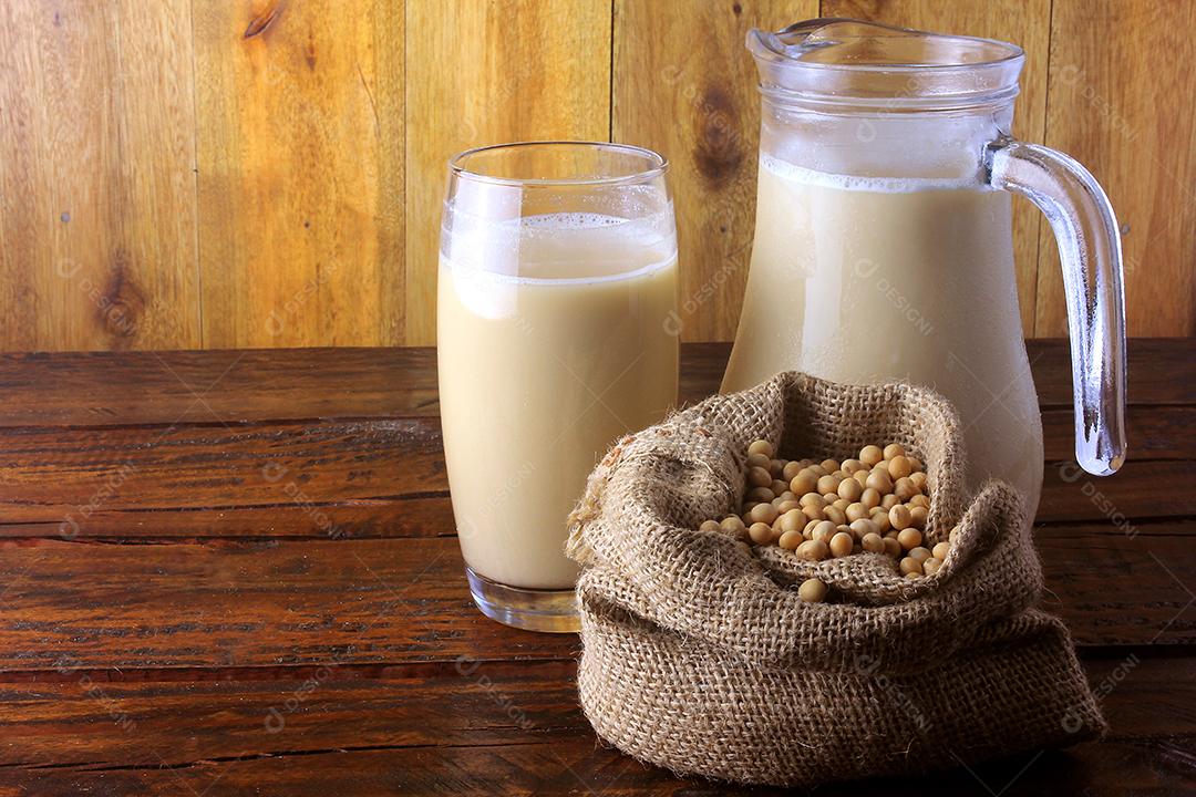 jarra e copo de vidro com leite de soja fresco e grãos em um saco rústico na mesa de madeira