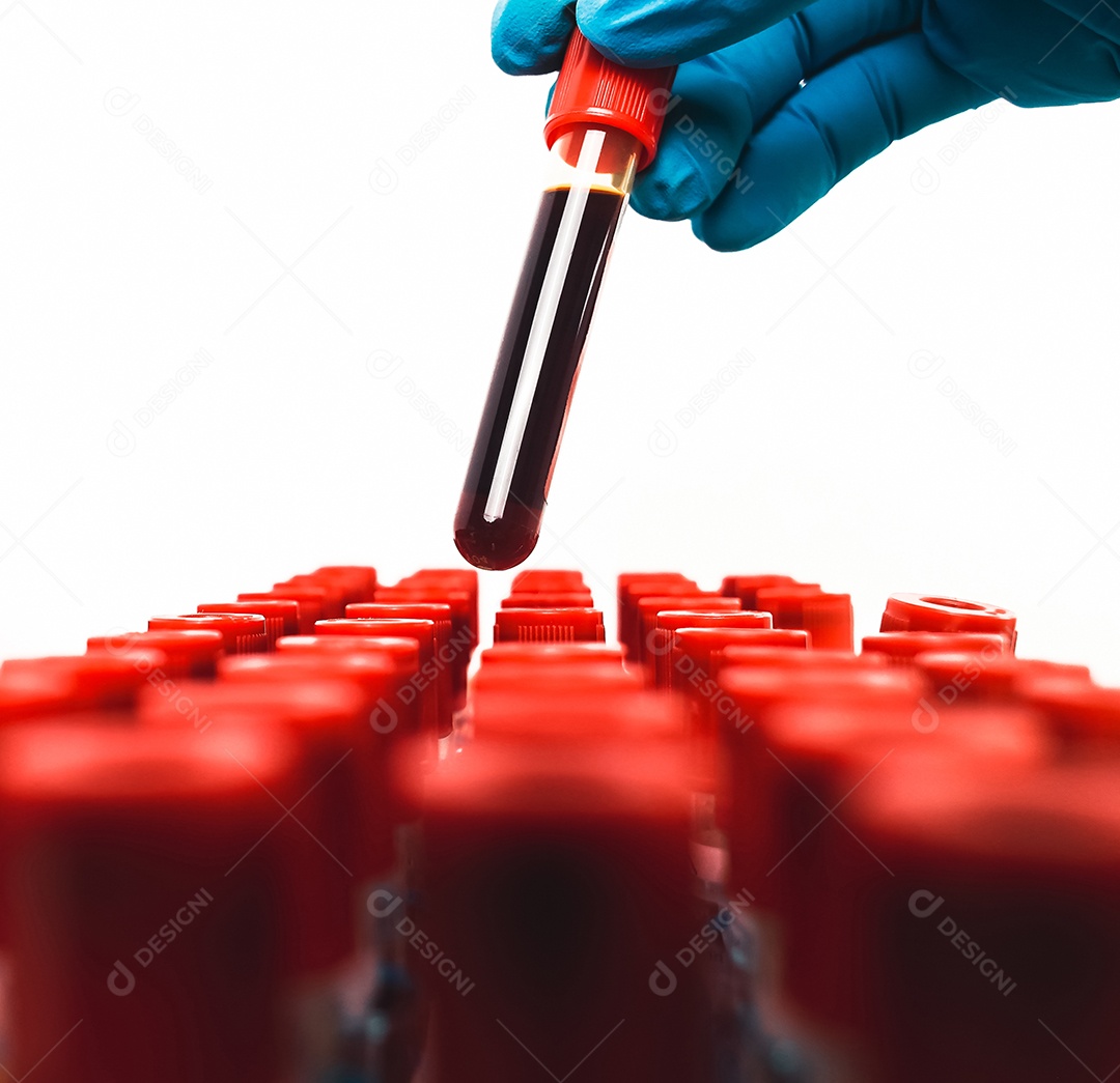 Um tubo de amostra de sangue com tampa vermelha está na mão de um azul