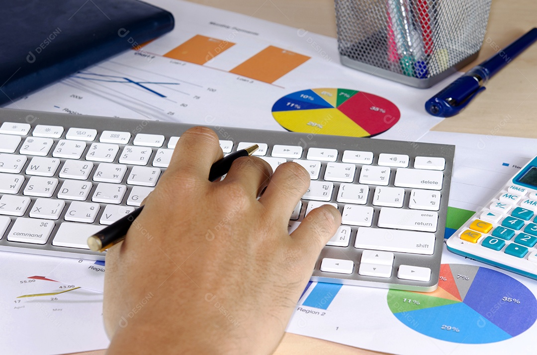 Documentos financeiros, computador e material de escritório close-up