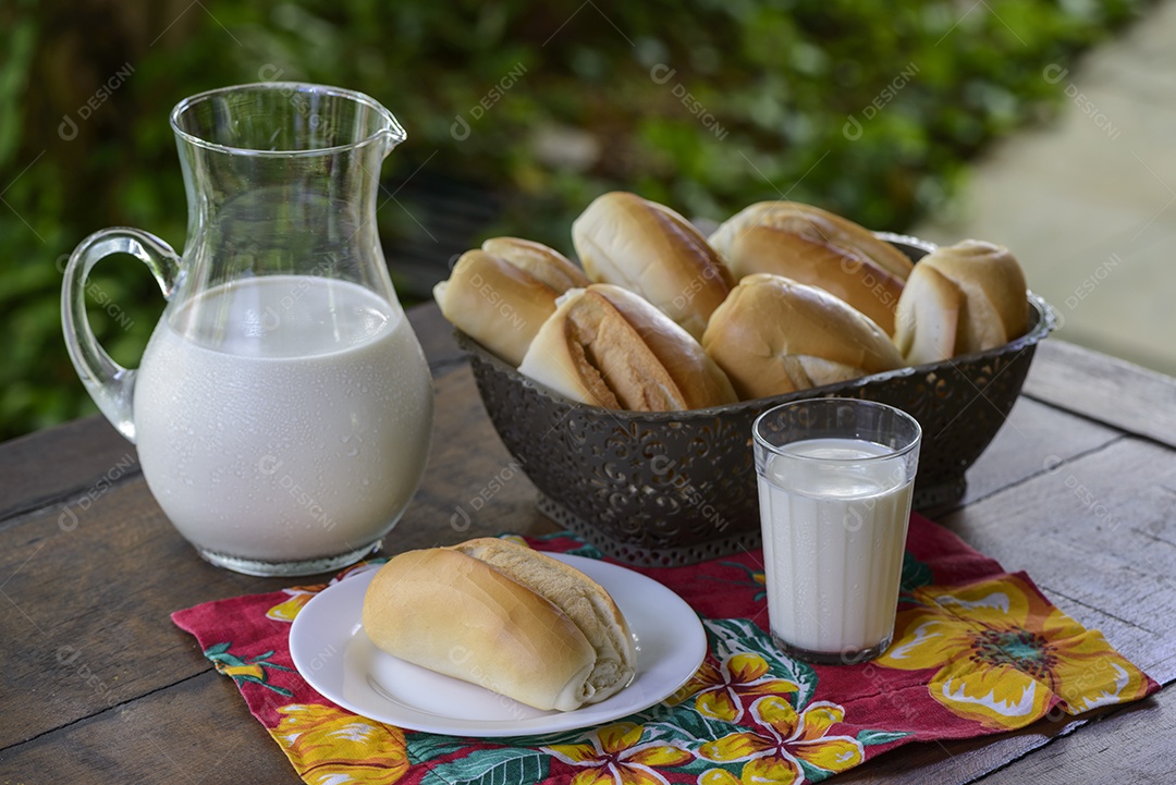 Pão em uma cesta e leite em uma jarra de vidro sobre uma mesa de ma...
