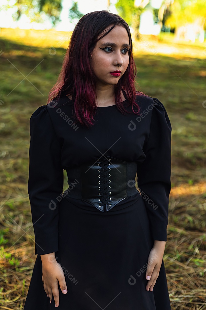 Jovem caucasiana de cabelos escuros com listras vermelhas em roupa de vestido preto com cinto espartilho e óculos posando para sessão de beleza feminina