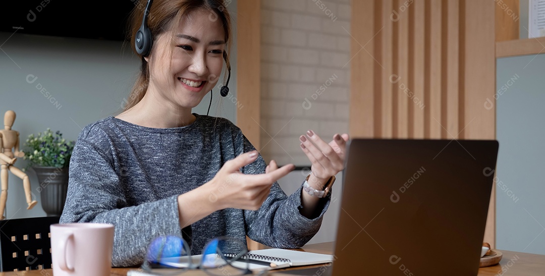 Mulher sorridente asiática freelancer usando fone de ouvido