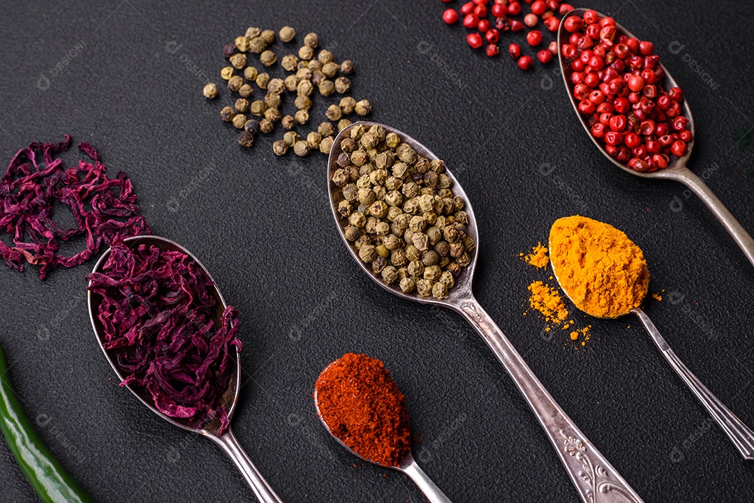 Vários tipos de especiarias em colheres de metal páprica, tomate, c...