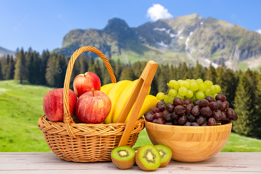 Agrupe frutas frescas saudáveis ​​em uma cesta de madeira