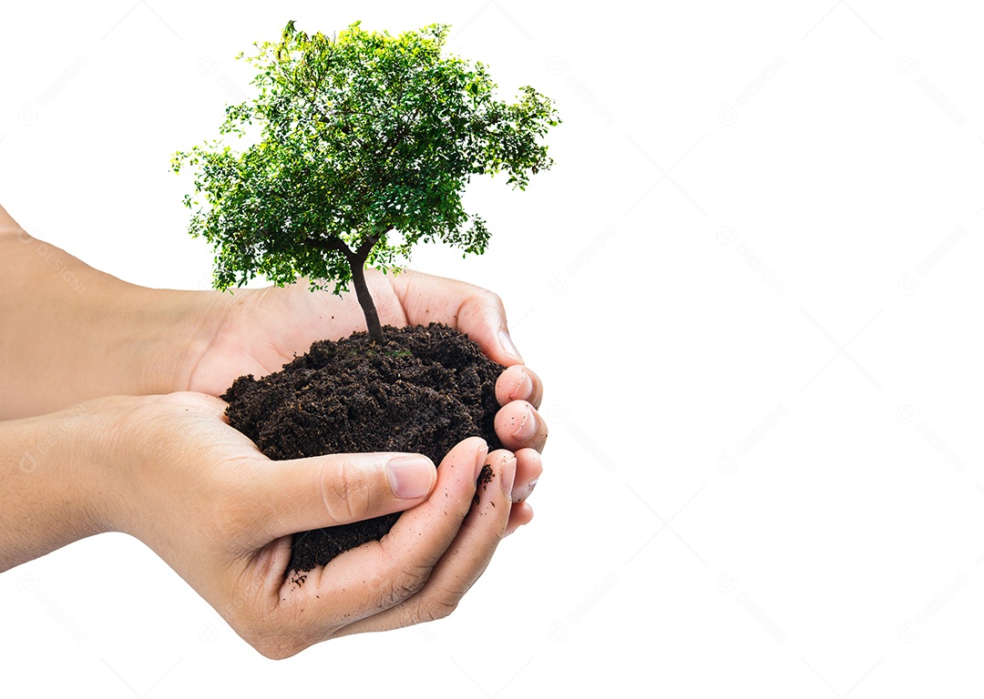 Mãos segurando uma planta jovem verde, pequena árvore isola o fundo...