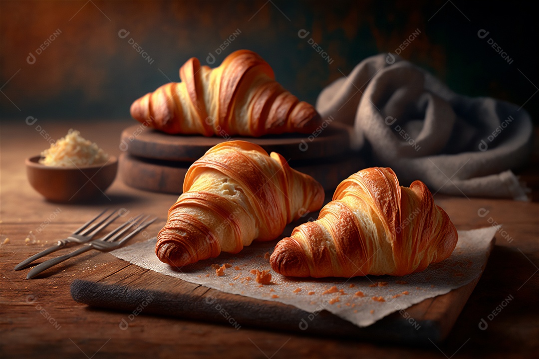 Deliciosos croissants caseiros na mesa de cozinha de madeira rústic...