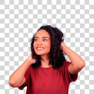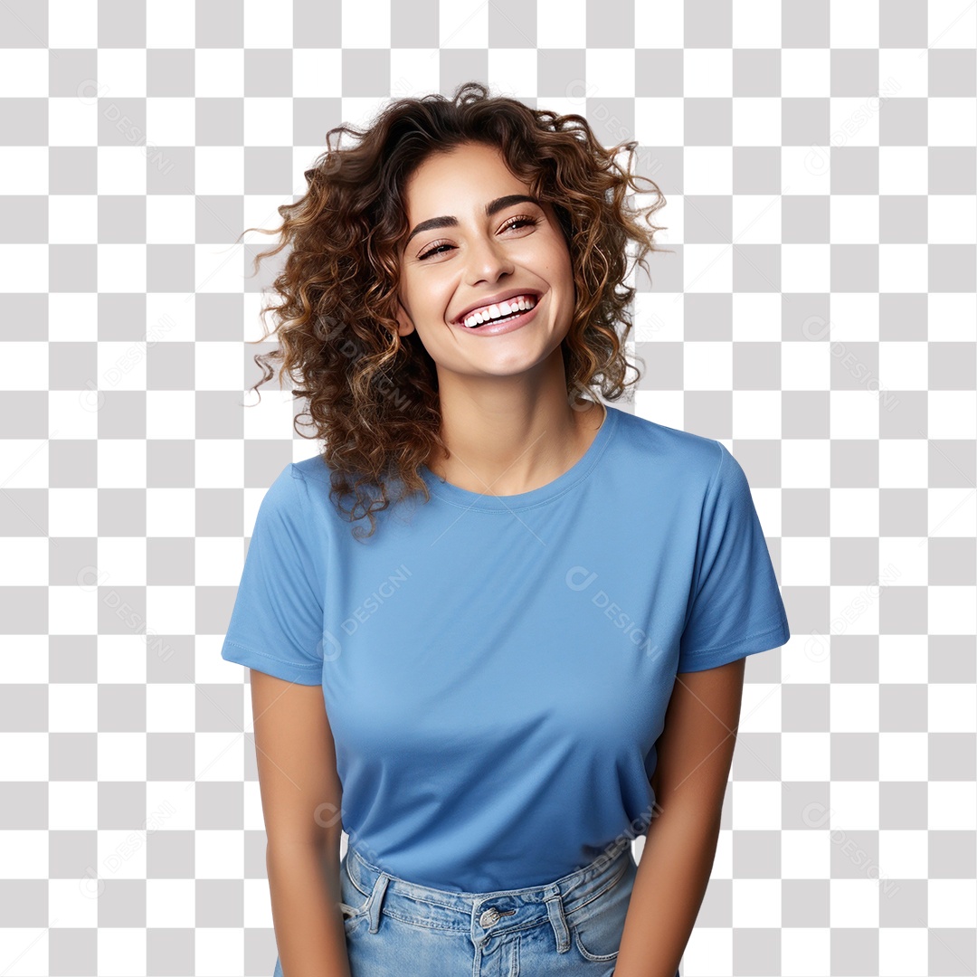 Mulher de Cabelo Cacheado e Blusa Azul Sorrindo Fundo PNG Transparente
