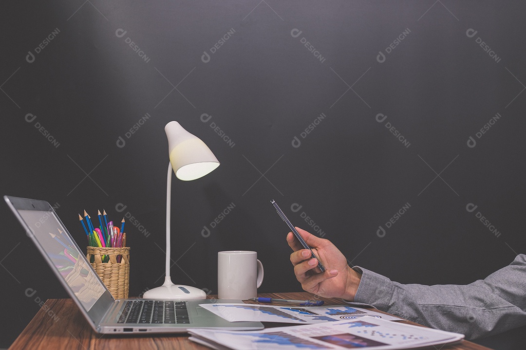 Empresário sentam no trabalho e verificam documentos na mesa da sala